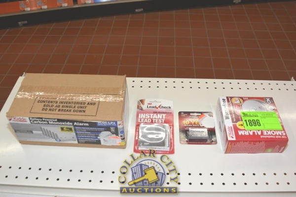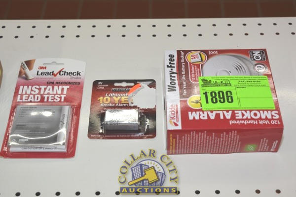 120 VOLTS HARD WIRED SMOKE ALARM, LEAD TEST KIT, 9 VOLT BATTERY, ALSO INCLUDES KIDDE 6 PIECE BATTERY POWERED CARBON MONOXIDE ALARMS