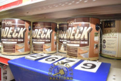LOT OF 9 GALLONS OF ZAR DECK AND SIDING COLOR STAIN AND UGL NUDECK WOOD AND CONCRETE RESTORATION COATING