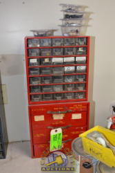 ORGANIZER BIN WITH TACKS, SCREWS, RIVETS, STORM WINDOW AND DOOR PARTS