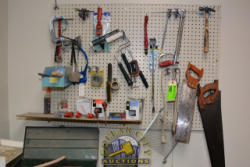 PEGBOARD LOT OF TOOLS CONSISTING OF HACKSAWS, HAMMER, ROLLERS, C CLAMP