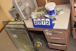 APPROX. 5' DESK WITH CONTENTS CONSISTING OF HP PRINTER, FAN, ROLLERS