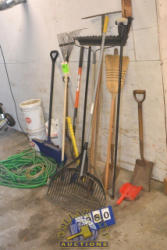 LOT OF ASSORTED RAKES, SHOVELS, GARDEN HOSE, BROOM