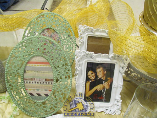 Lot of 5 bottles, 5 candle holders ,4 paper lanterns, 4 picture frames, garland, wire flowers, serving trays and floral vase.