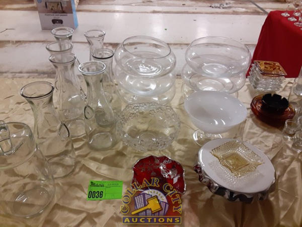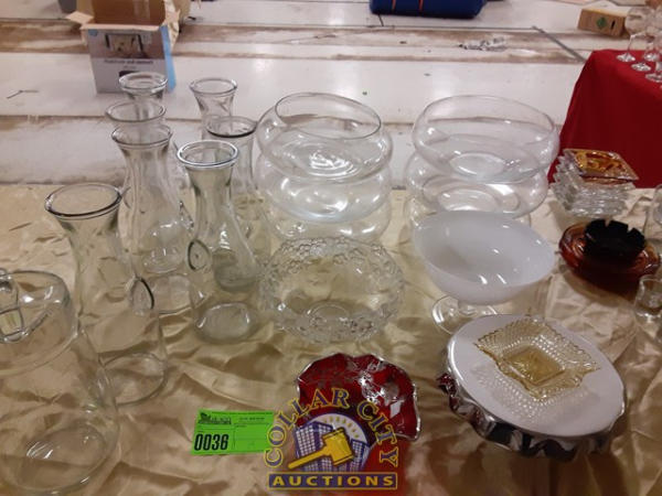 7 old milk jugs, 6 round candleholders, 5 serving dishes, 1 beverage server