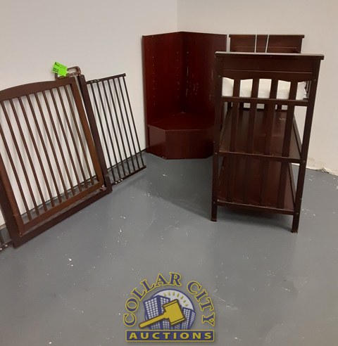 Dark wood changing table, gate and corner shelf.