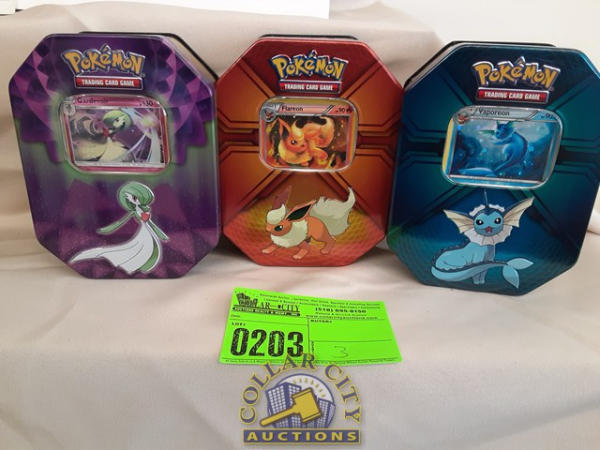 3 Pokémon tins with 1 card each in them