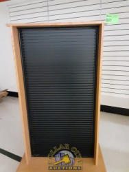 wooden display rack, on wheels in great condition. slat wall hooks not included