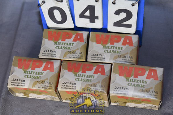 Lot of 5 boxes of 20 Cartridges (100 Cartridges total) of WPA Military Classic .223 Rem, Non-corrosive Berdan Primed, 55 Grain, FMJ Steel Case Cartridges