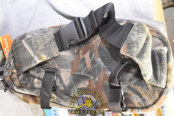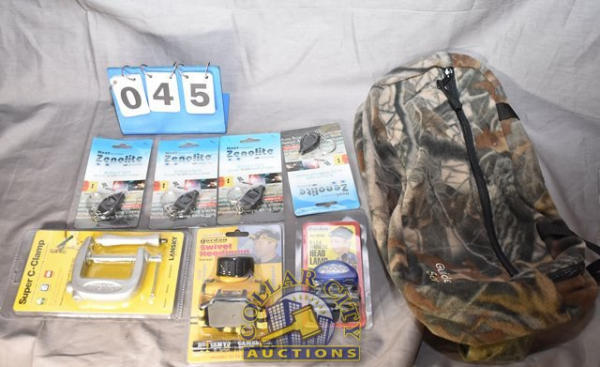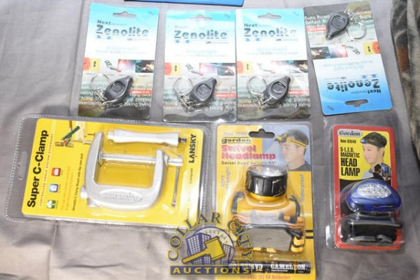Lot of 4 Xeno Light Keychain Lights, 1 Gordon 5 LED Magnetic Headlamp, 1 Gordon Swivel Headlamp, and a Lansky Sharpeners Super C Clamp in a Guide Series Fleece Fanny Pack