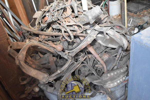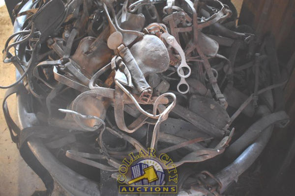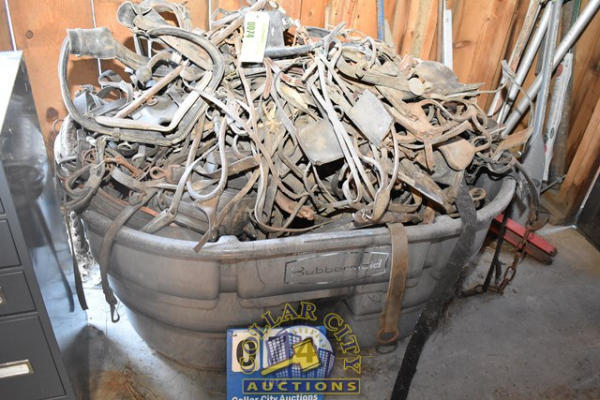 Bucket lot consisting of assorted horse harnesses, bridles, bits, blinders, etc.