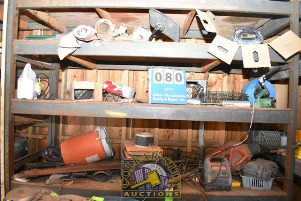 Multiple shelf lot consisting of jump starter, gas can, sprayer, caulk gun, etc.