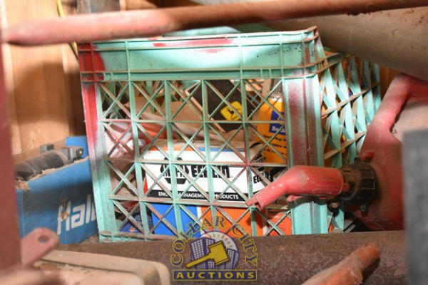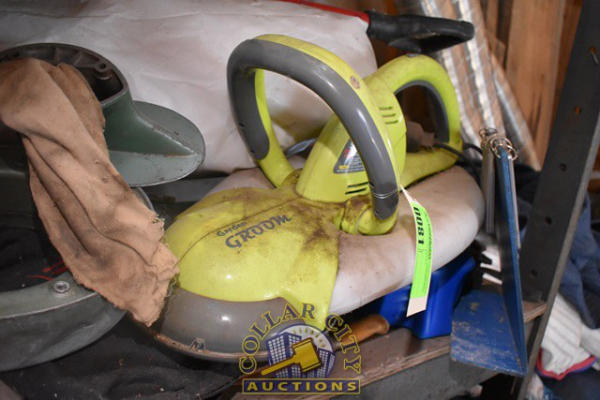 Shelf lot consisting of box fan, garden groom, car parts, etc.