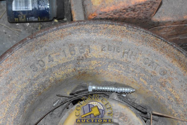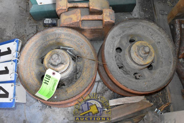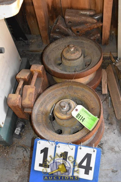 2 Front idler wheels (believed to be part # 304-1881) and 2 tractor weights.