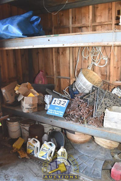 Multiple shelf lot consisting of concrete forms, decorative metal accents, race fuel can, pool cover, etc.
