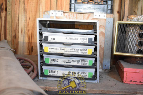 Multiple shelf lot consisting of assorted nuts, bolts and screws, roll of plastic, threaded rod, LED lights, etc.