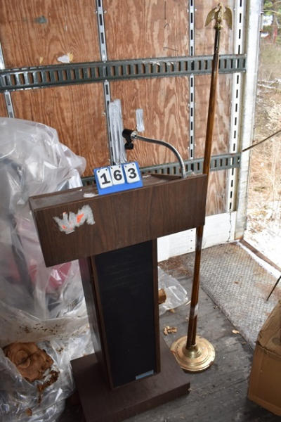 Lot includes a Perma Power Sound Systems Podium on wheels with sound system and an indoor flag pole