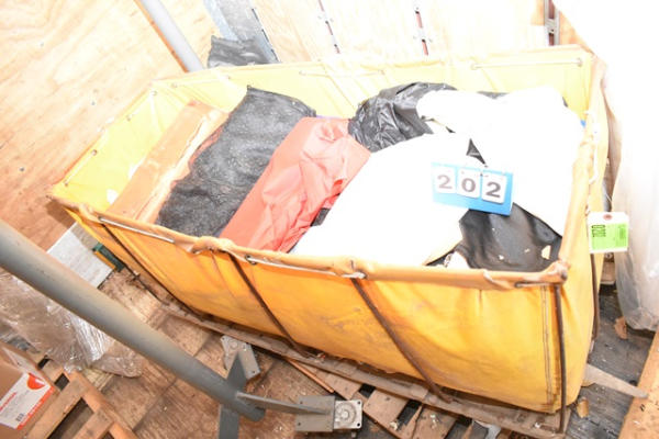 4-wheel laundry cart, 1 wheel broken off, but it is with the cart. Cart is full of various fabrics