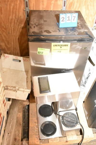 Lot includes a believed to be unused Avanti 20" x 21" x 31" mini refrigerator, a Coffee Pro 3-pot coffee warmer