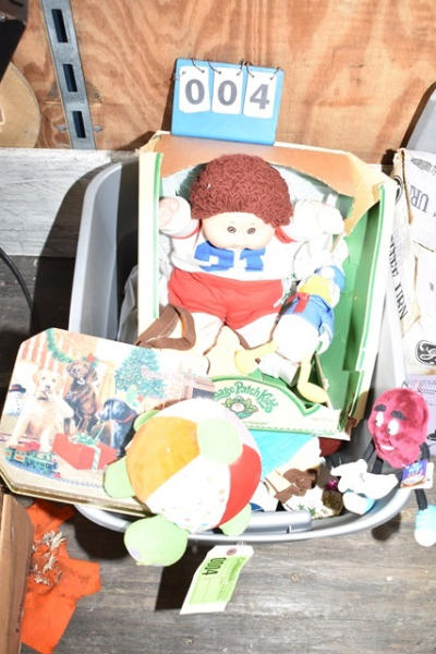 Lot includes a NY Giants Cabbage Patch Kid (damage to box), vintage Russell Stover box, various children's toys