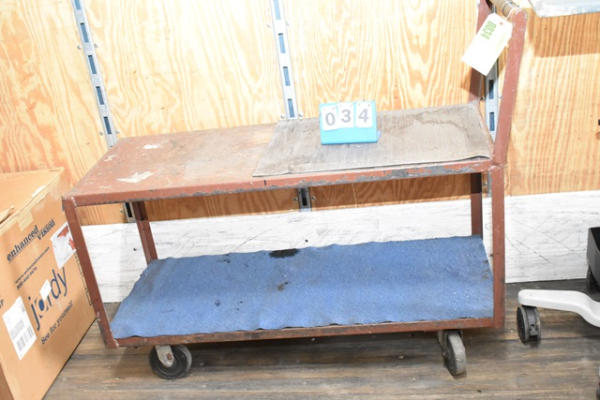 Approx. 44" long x 18" wide x 25" tall (plus 14" for handle), 4-wheeled 2-shelf metal cart