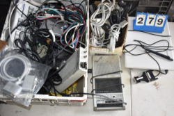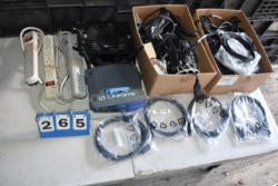 Lot includes a vintage Radio Shack 2.4 GHz wireless camera, Linksys router, printer cables, IO Gear 7 port USB 2.0/Fire Wire Hubs, a Dell rechargeable Lithium Ion battery module, speakers, etc.