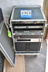Roll around case with DJ Equipment including Chandler Industries CP 1200, and Alesis M-EQ230, a PD5 Professional Delay System, a Wheatstone Model 1202A compressor-limiter, an Ashly 3-way electronic cross over Model XR70E, Carver Model PM-1.5 Magnetic Field Power Amplifier, and 2 Ramsa WP-1400 2-channel power amplifiers