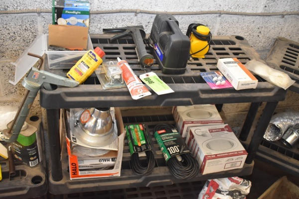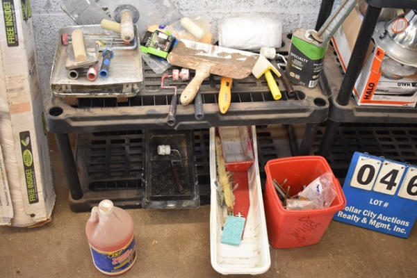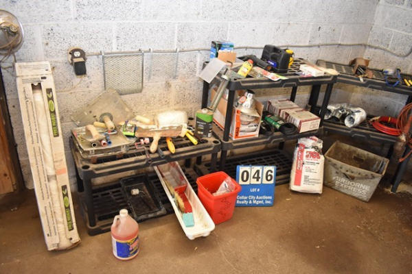 Shelf lot consisting of paint supplies, caulk guns, 12-volt compressor, etc.