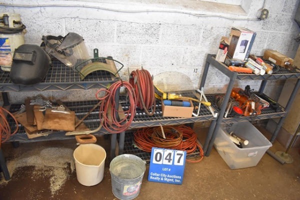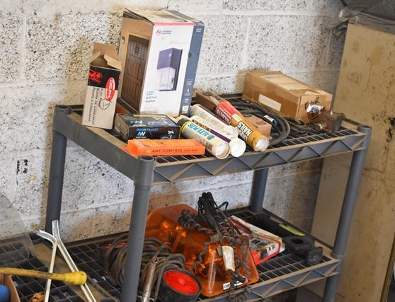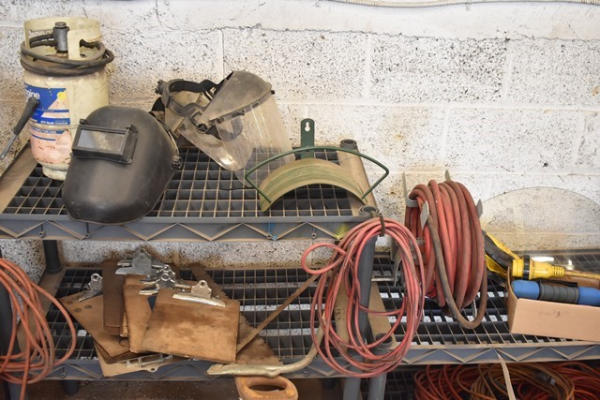 Shelf lot consisting of welding masks, air hose on reel, lead cords, caulk, roof mounted lights, etc.