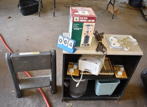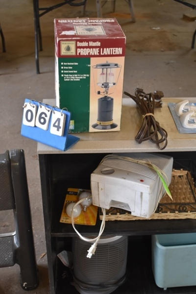 Shelf lot consisting of double mantle propane lantern, light bulbs, heaters