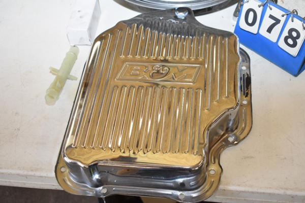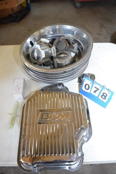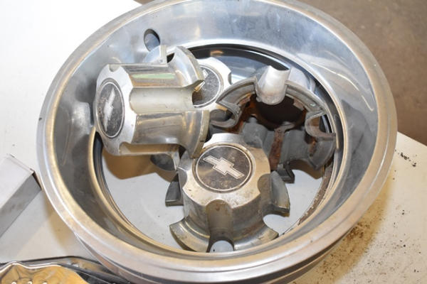 Lot of Chevy hubcaps and an oil drain pan