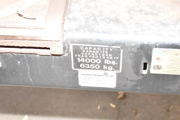 4-post drive-on lift by Wheeltronic, Model EELR507A, 14,000 lbs. capacity. Buyer Must Supply Certificate of Insurance Prior to Dismantling.