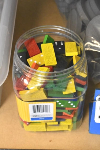 Shelf lot of assorted Dominoes, foam, puzzle pieces, educational books, etc.
