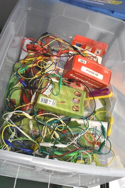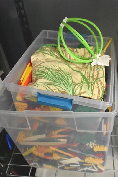 Shelf lot of assorted K'nex pieces, electrical testers and tote of electrical items