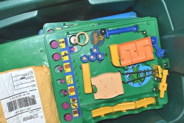Shelf lot of assorted children's educational toys and Clear View Base 10 starter set