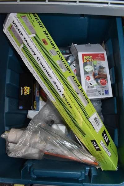 Shelf lot consisting of Hot Dog Interactive Pens, Merf money counter and rods, butterfly puzzles and children's educational books