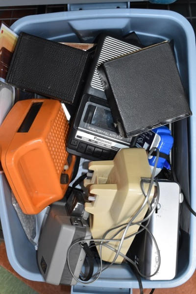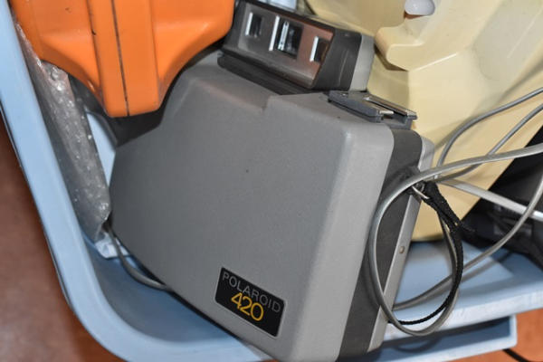 Shelf lot consisting of assorted Polaroids, projectors, 30 gig iPod, etc.