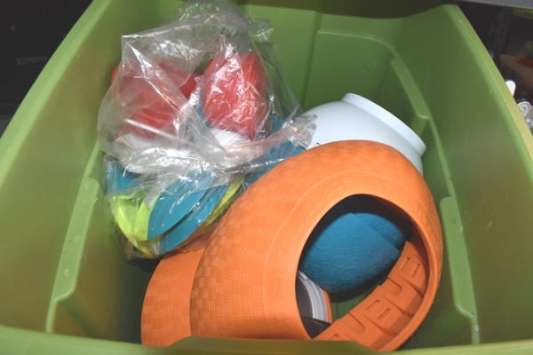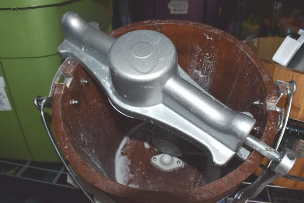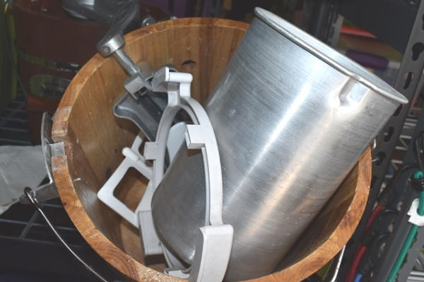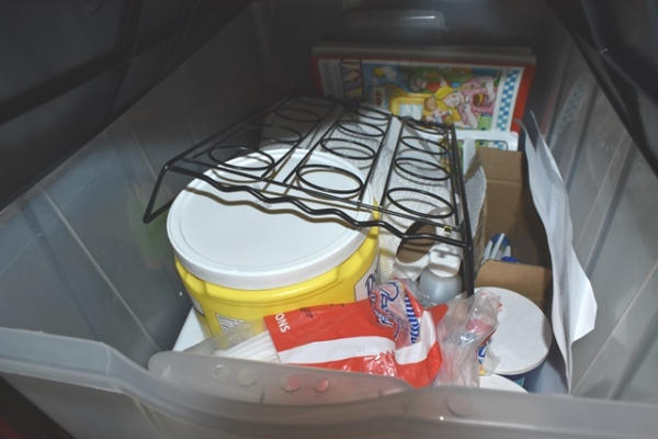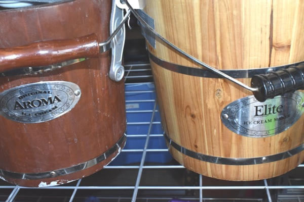 Shelf lot consisting of kitchen supplies including Iodine Salt, sugar, plastic spoons, measuring cups, and 2 ice cream makers