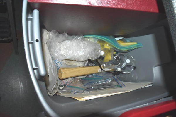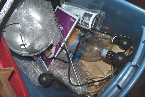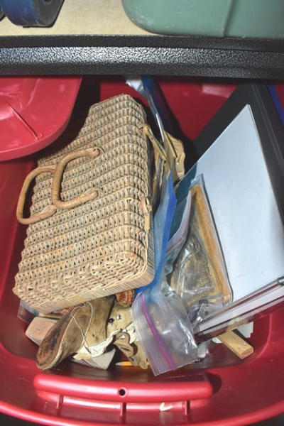 Shelf lot consisting of identified rocks, safety glasses, hammer and other artifacts