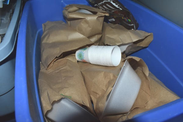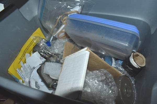 Shelf lot consisting of books, paper, styrofoam dishware, magnets, etc.