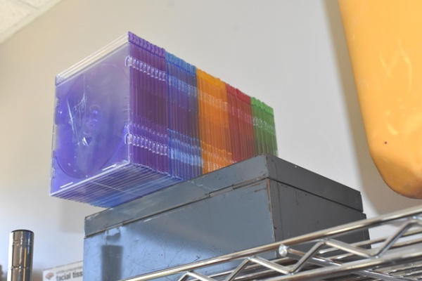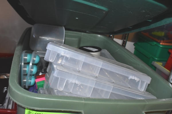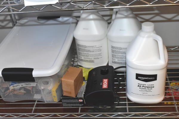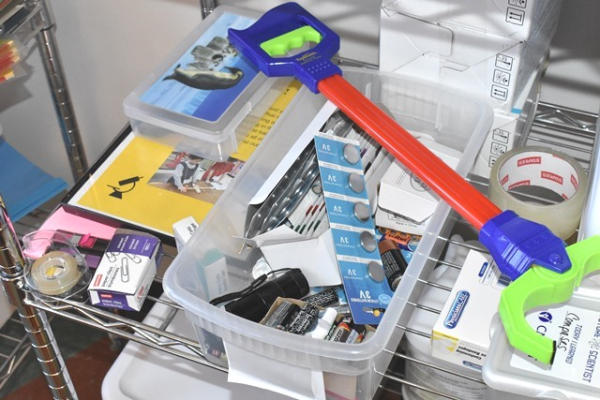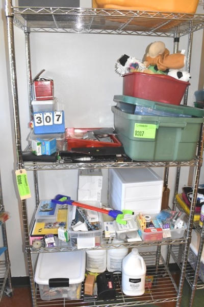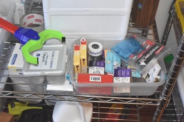 Shelving contents consisting of assorted office supplies, batteries, paper clips, all-purpose school glue, etc.