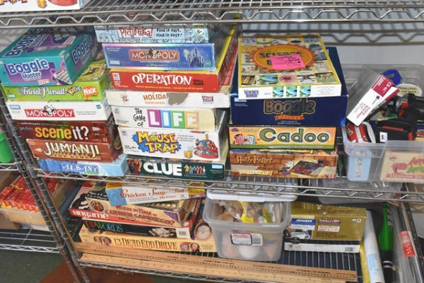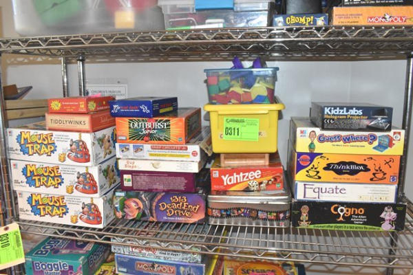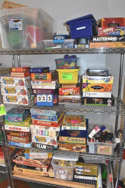 Shelving unit lot consisting of games including Mouse Trap, Outburst, Gala Life