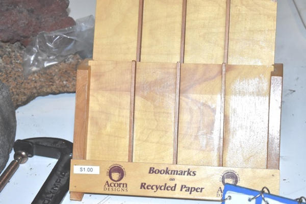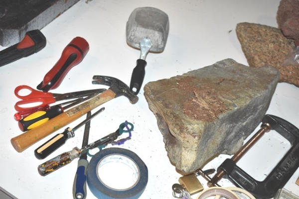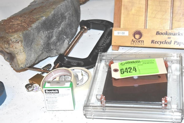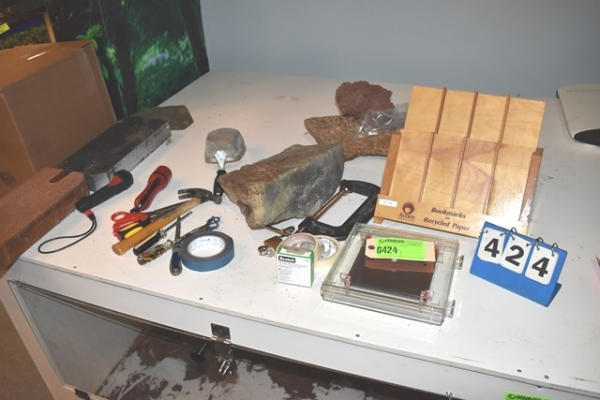 Table contents consisting of hand tools, hammer, screwdriver, scissors, c-clamp, bookmark holder, etc.