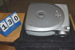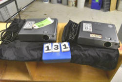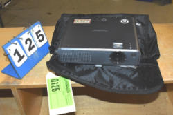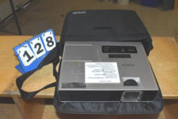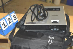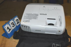 Shelf lot consisting of an Epson projector with 2 bags and tote of assorted wires, etc.