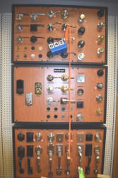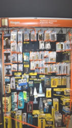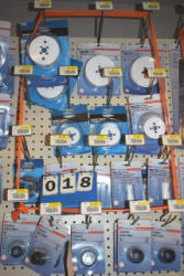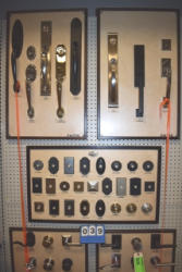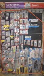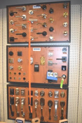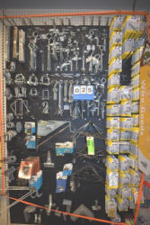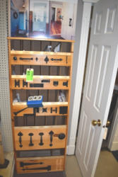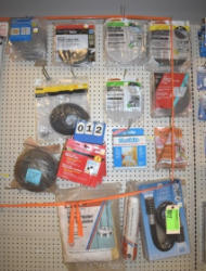 Pegboard lot of assorted coat hooks, latches, lid supports, door stops, etc.