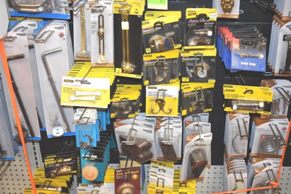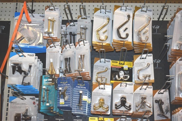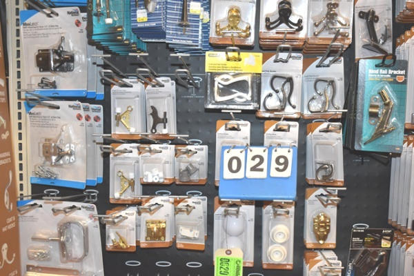 Pegboard lot of assorted coat hooks, latches, lid supports, door stops, etc.