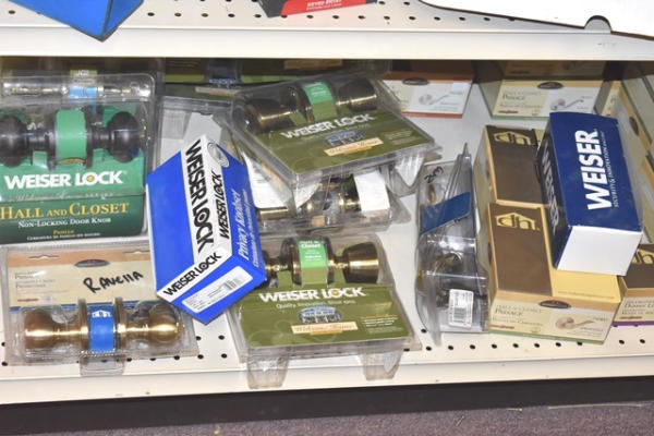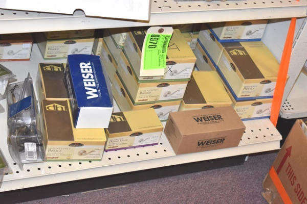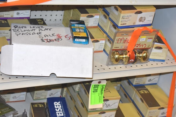 2 shelf lots of Design House door knobs, bed & bath privacy, Kwikset, Weiser, etc.