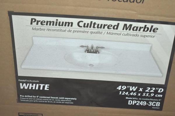 Premium cultured marble vanity top, 49" wide x 22" deep