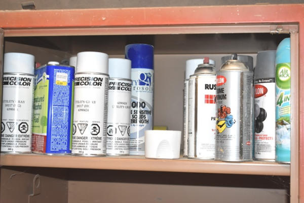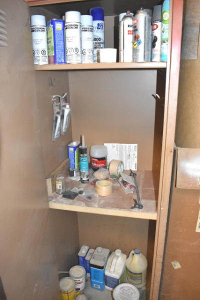 Approx. 6' tall single door cabinet with contents consisting of glue, roof cement, paint