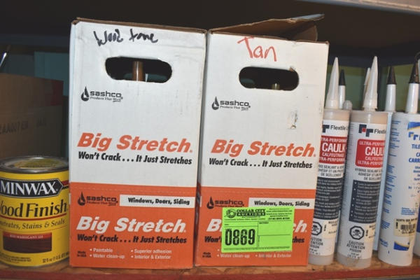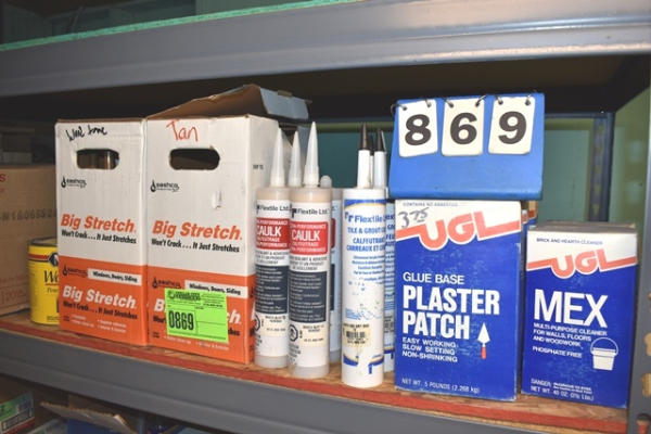 Shelf contents consisting of assorted plaster patch, caulk, stain, etc.