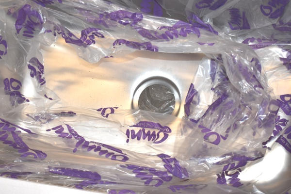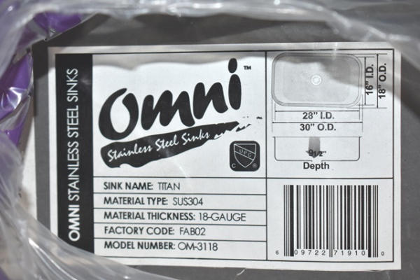 Lot of 2 Omni single bowl stainless steel sinks, overall outer dimension is 30"